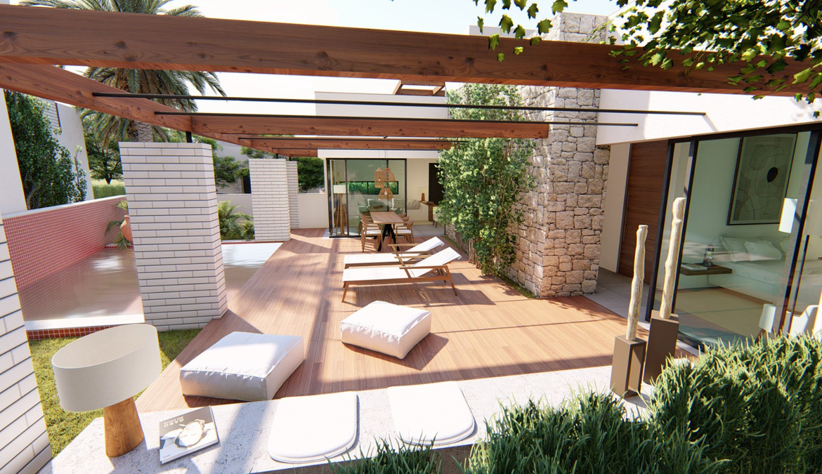 The villas feature a modern interior with Mediterranean accents such as natural stone and wood, all set in a quiet and easily accessible location.