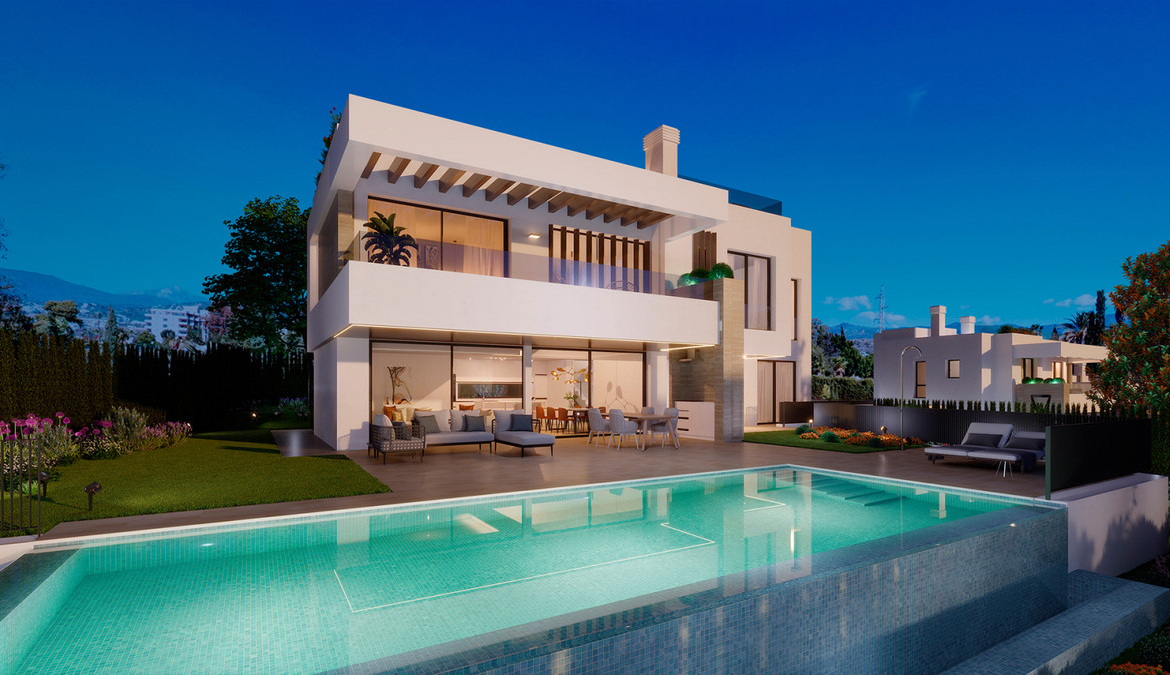 New development of 7 luxury south facing detached villas in a prime location of Estepona, in walking distance to Atalaya Golf Club and within a short drive to all amenities, the beach and Puerto Banús. Boasting large private pools and gardens, 3 or 4 en-suite bedrooms, full basement and garage for 2 cars, rooftop with sea views, extensive terraces, double height living room ceilings, top brands and qualities, underfloor heating throughout and aerothermal heating technology, full cost-free interior customization and interior design service, flexible interior architecture, and full after-sales service. With the guarantee of one of the leading and longest established European developers.