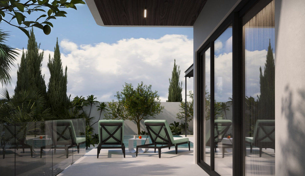 Bright living room with access to the garden and private pool (approximately 3 x 8 m).