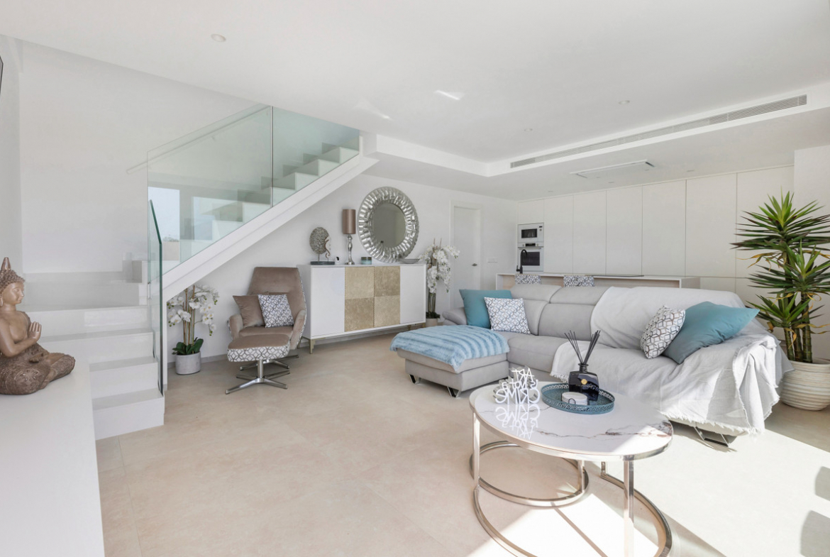 The residence features a private swimming pool, a sunny solarium, and bright interiors enhanced by air conditioning, modern lighting, and quality appliances. Its open-plan layout and contemporary finishes make it perfect for relaxing, entertaining, or enjoying the Mediterranean climate year-round.