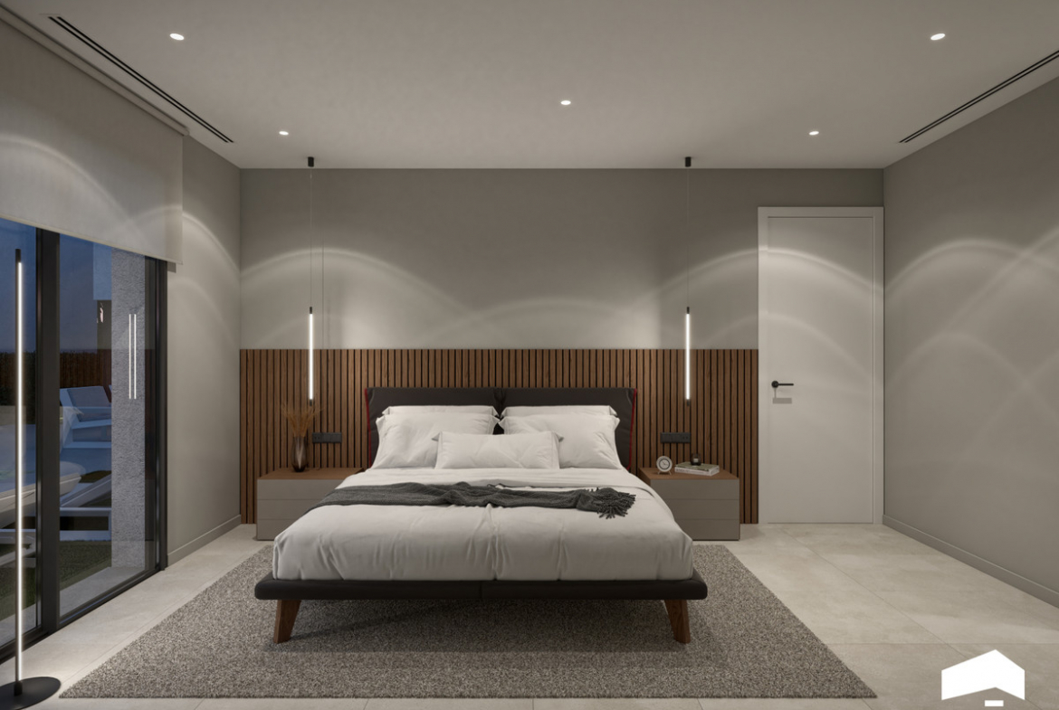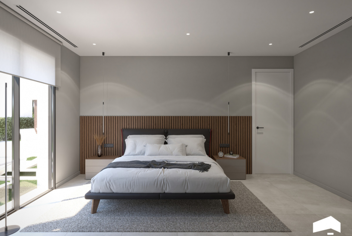 The villas are built over two floors and feature 3 bedrooms, 2 bathrooms, and a guest toilet. They are designed in a contemporary style with an open-concept layout, consisting of a fully equipped kitchen and a combined living-dining room. The villas include fitted wardrobes, a private garden with a pool, off-road parking space, and a private solarium.