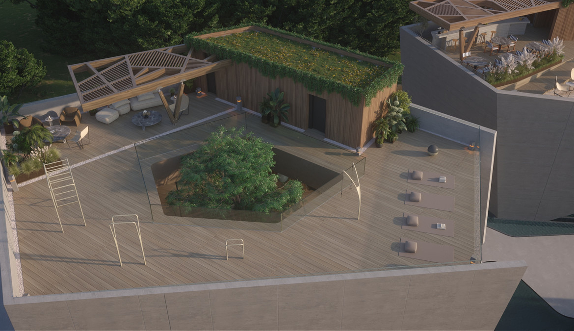 The project's commitment to the highest standards is reflected in all areas, especially in its impressive and professionally landscaped communal spaces. The Social Club, with its innovative and avant-garde architecture, located in the highest part of the project, houses a complete SPA, a 200 sqm indoor gym, an outdoor gym with a yoga zone, a coworking area and an indoor heated pool.