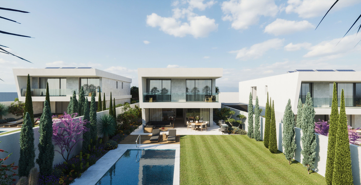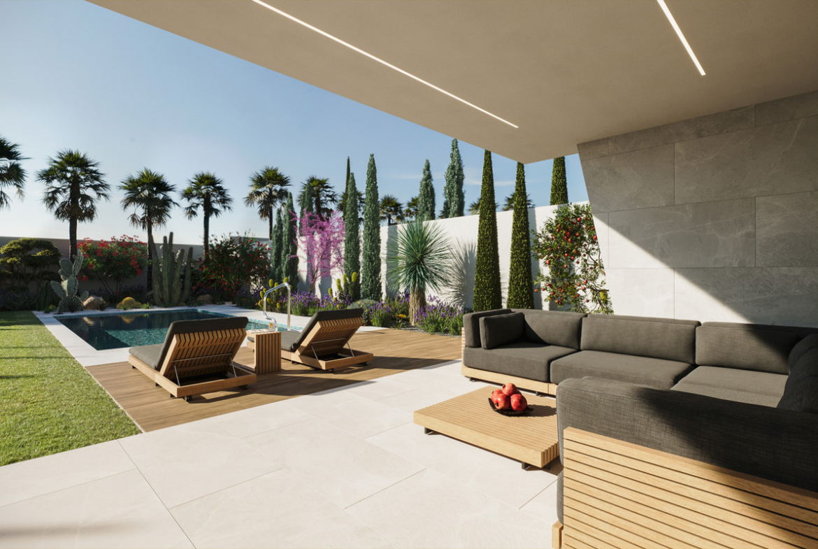 In addition, the villa will be partially furnished with custom-made furniture, which is included in the quoted price. We will be pleased to provide you with a list and technical specifications upon request. Essentially, you will receive all items shown in the visuals, with the exception of the sofa, armchair, chairs, bar stools, mattresses, TV, outdoor furniture, barbecue, and decorations, which can be purchased according to personal preferences.