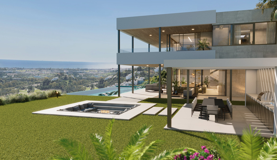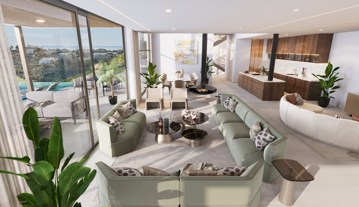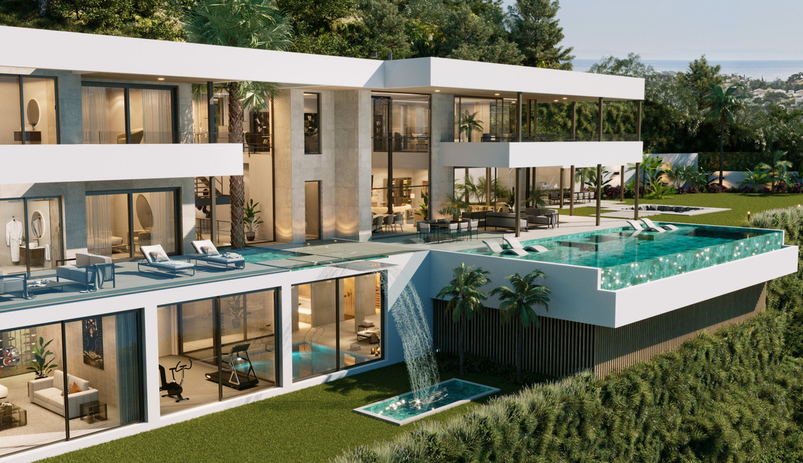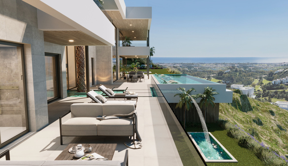 We present you two Costa del Sol diamonds: Hope and Tiffany, part of a new, exclusive project. Located in El Madroñal, Benahavís, the villas offer stunning panoramic views of the golf course, sea and the coastline extending to Gibraltar and Africa. Each villa features 3 levels, 6 bedrooms, 7 bathrooms, 3 toilets, and 4 kitchens: main, service, personnel, and outdoor. Every bedroom includes an en-suite bathroom and private terrace, offering spectacular sea and golf views. The lower level is dedicated to leisure, with various areas including a separate apartment for personnel. Additionally, there will be a terrace with a fire pit, different chill-out areas, a floating infinity pool made of purifying Indonesian stone with a jacuzzi, and a garden. An exceptional feature of this villa is the breathtaking views available from almost every room, including the gym and SPA on the lower level.