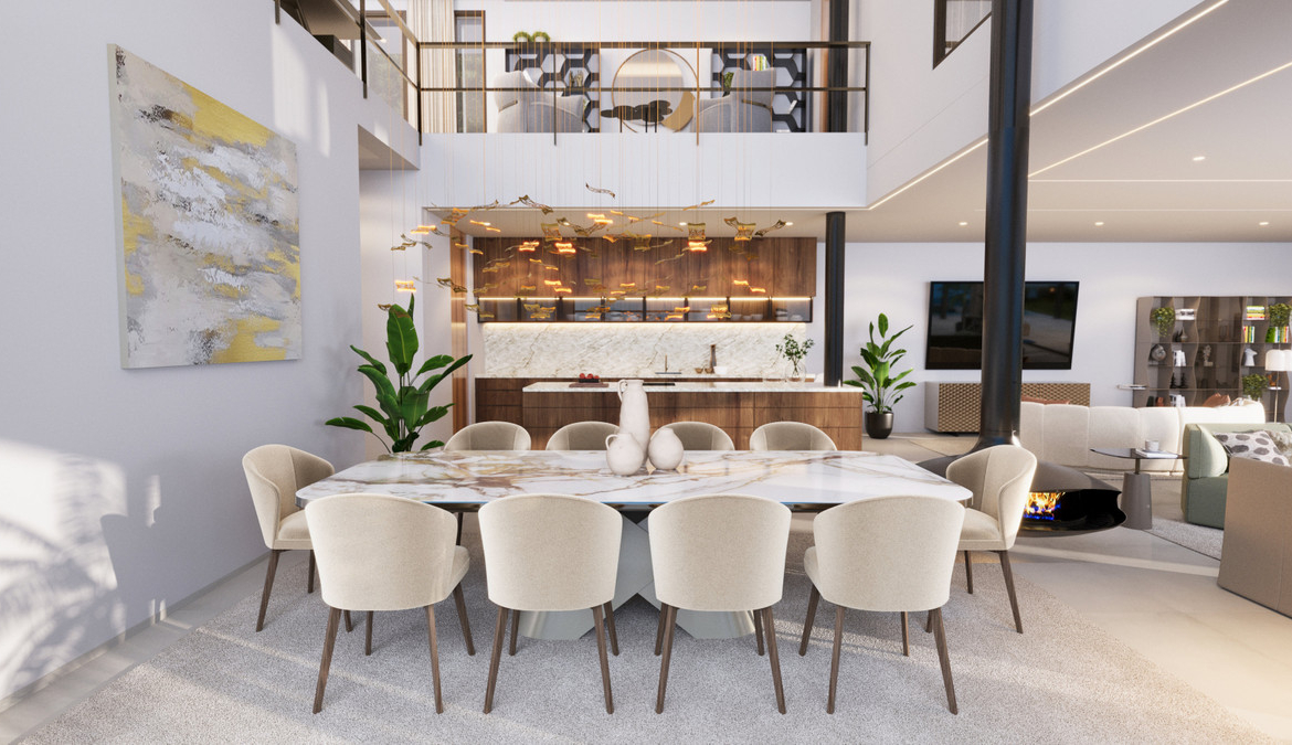 On the ground level, the main entrance leads to the left wing where you'll find open space living and dining areas with a kitchen boasting double-height ceilings. The living area features a hanging chimney operated with a remote control, allowing it to be moved around. A door in the kitchen connects to the service kitchen, which has private access for personnel.