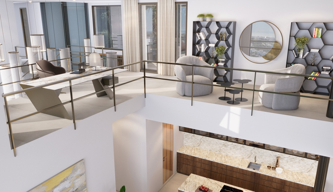 The first floor has two wings as well. The left wing features the spacious master bedroom with an en-suite bathroom, toilet, and walk-in closet, which includes a central island for storing the most valuable items of your wardrobe, such as jewelry and unique bags. The island also includes a hidden feature. The master bedroom's private terrace includes a chill-out area and sunbeds. The left wing also includes an office and library, where the windows can also be fully opened, similar to the living area. The right wing contains two more bedrooms with en-suite bathrooms and private terraces.